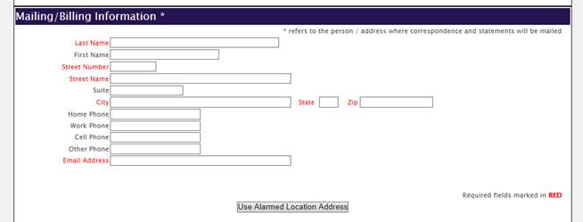 The next section, Mailing/Billing Information will be where the address and information for where all correspondences will be mailed to is filled in. All the fields colored red must be filled in. If the information is the same as everything on the Alarm Location section, click the Use Alarmed Location Information button at the bottom of the section. This will copy over all the information that was entered in the Alarmed Location section to this section. If the information is different (for example, the mailing address is a PO Box or mail is sent to the corporate office) this will need to be entered in. For commercial locations, the name of the company that will be receiving the mail must be entered in (it can be either the same or different as the Alarm Location name). The address must be entered in the same way as for the Alarm Location section, the Street Number and Street Name must be entered in their own specific fields. If the address is a PO Box, the PO will go in the street number field, and the Box with number will go in the Street Name field. This address does not need to be validated. Contact phone number and email can be entered in as well.