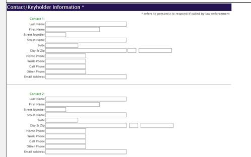 The Contact/Keyholder Information section is where names and phone numbers of people who can be contacted about the alarm system will be listed. This record is for the police/fire department in order for them to have a list of people who they can get in contact with besides the main contact information from the Alarm Location section. Two contacts can be listed on this section.