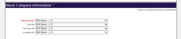 *The two alarm company fields shown in picture may not be the only ones available. There can be up to four alarm company options, as listed above.*