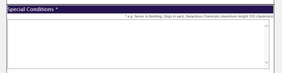 The Special Conditions section is where any information beyond what is listed in the other sections should be written. Information typically included here would be if there are any dogs in the yard, guns on the premise, any medical needs of the occupants, or if there are hazardous chemicals on premise. These conditions are provided to the police/fire officers responding to the alarm system. This will provide them with information about the location in order to fully assist the situation.
